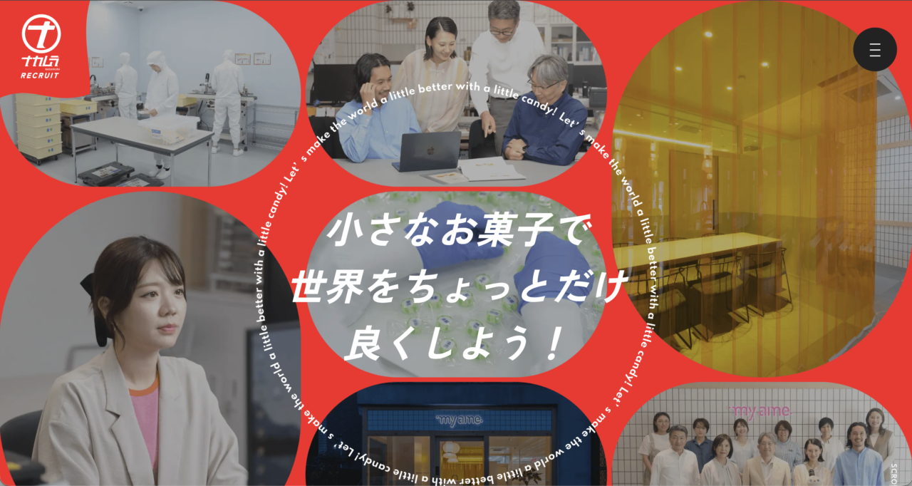 「小さなお菓子で世界をちょっとだけ良くしよう」というミッションを掲げ、社員メッセージ・数字で見る会社・先輩インタビューなど、ストーリー+数値で信頼を築く構成が印象的です。