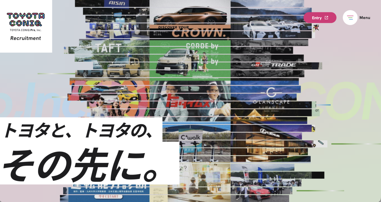 “トヨタ × 広告会社 × 新ビジネス創出”というユニークな企業モデルを前面に打ち出し、事業内容や社員インタビュー、プロジェクトストーリーを通じて ブランド体験を採用設計に落とし込む工夫 が目を引きます。