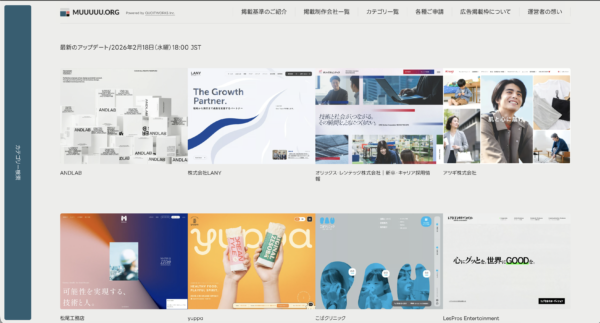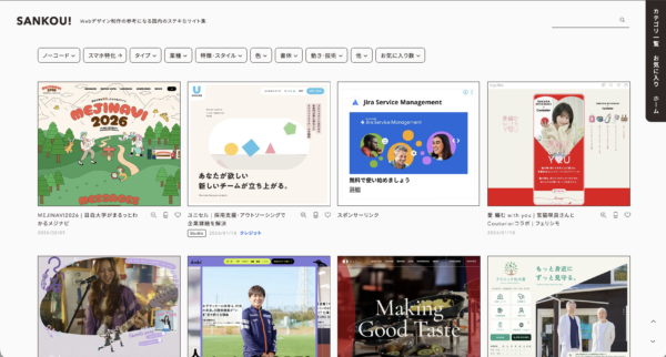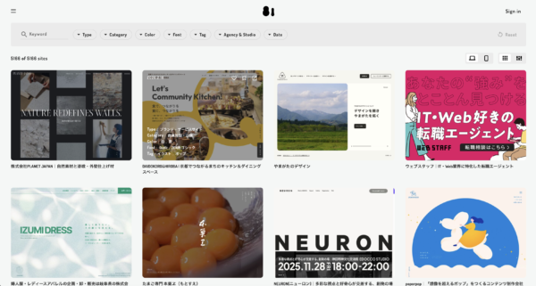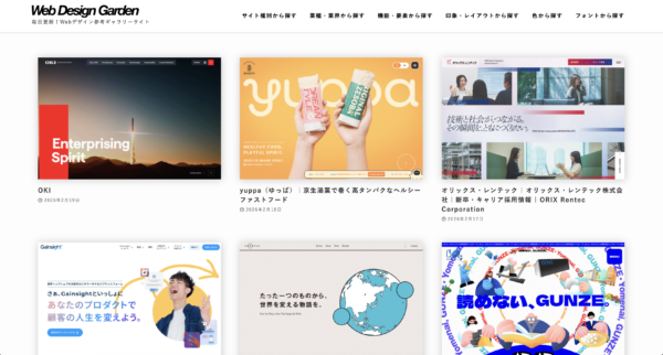 毎日更新されるWebデザインギャラリーサイト。サイト種別(コーポレート・採用・EC・LP・キャンペーンサイトなど)と業種・業界の両軸から絞り込みができ、目的に合った参考事例を効率よく見つけられる。