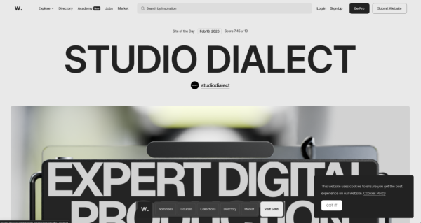 2009年設立のスペイン発、世界最高峰のWebデザインアワードサイト。審査員がデザイン・ユーザビリティ・クリエイティビティ・コンテンツの4軸で採点し、毎日・毎月・毎年の最優秀サイトを選出。詳細ページでは使用フォントやカラーパレット・技術情報も確認できる。無料でブックマーク機能も利用可能。
