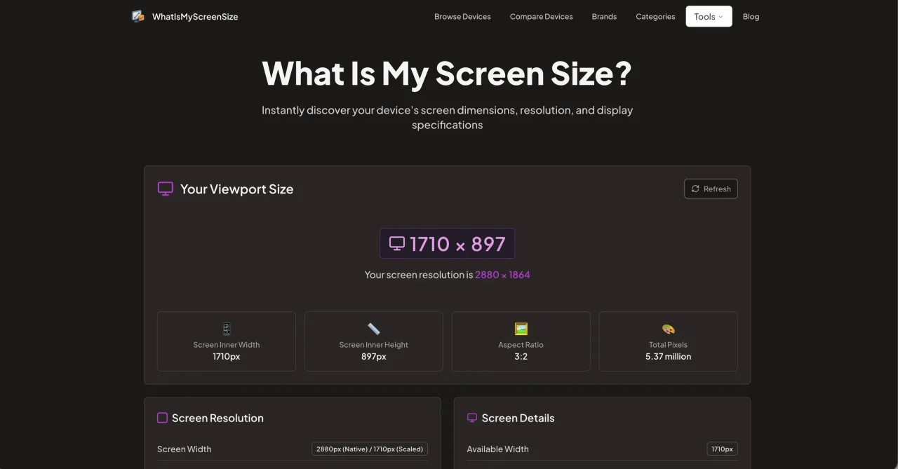 スクリーンのピクセル密度(PPI)をすぐに計算してくれます。画像の最適化やレスポンシブデザインを検討するときに役立ちます。