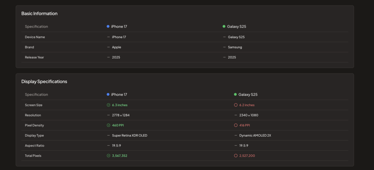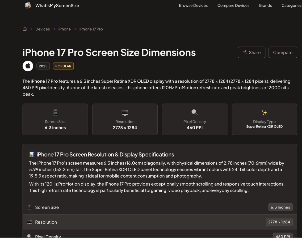 iPhone 17 Proのページを開いてみると、スクリーンサイズや解像度はもちろん、ディスプレイのタイプ(OLED/LCDなど)やリフレッシュレート、輝度まで一覧で確認できました。これだけ揃っていると、調べ直す手間がぐっと省けますね!