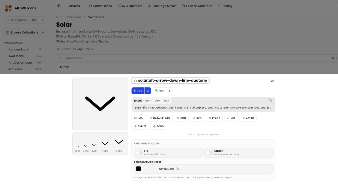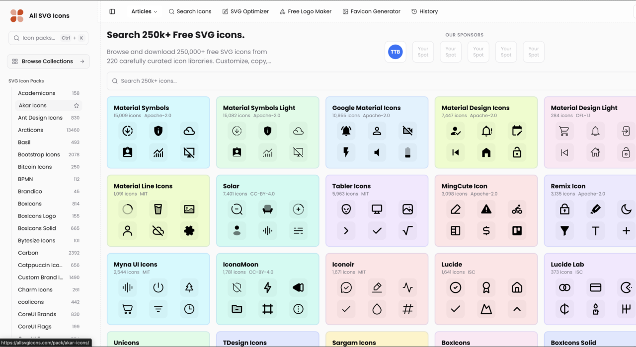 そんなときに便利なのが「All SVG Icons」です。220種類以上のSVGアイコンライブラリを横断して検索・ダウンロードできるサービスで、登録不要・完全無料で使えます!