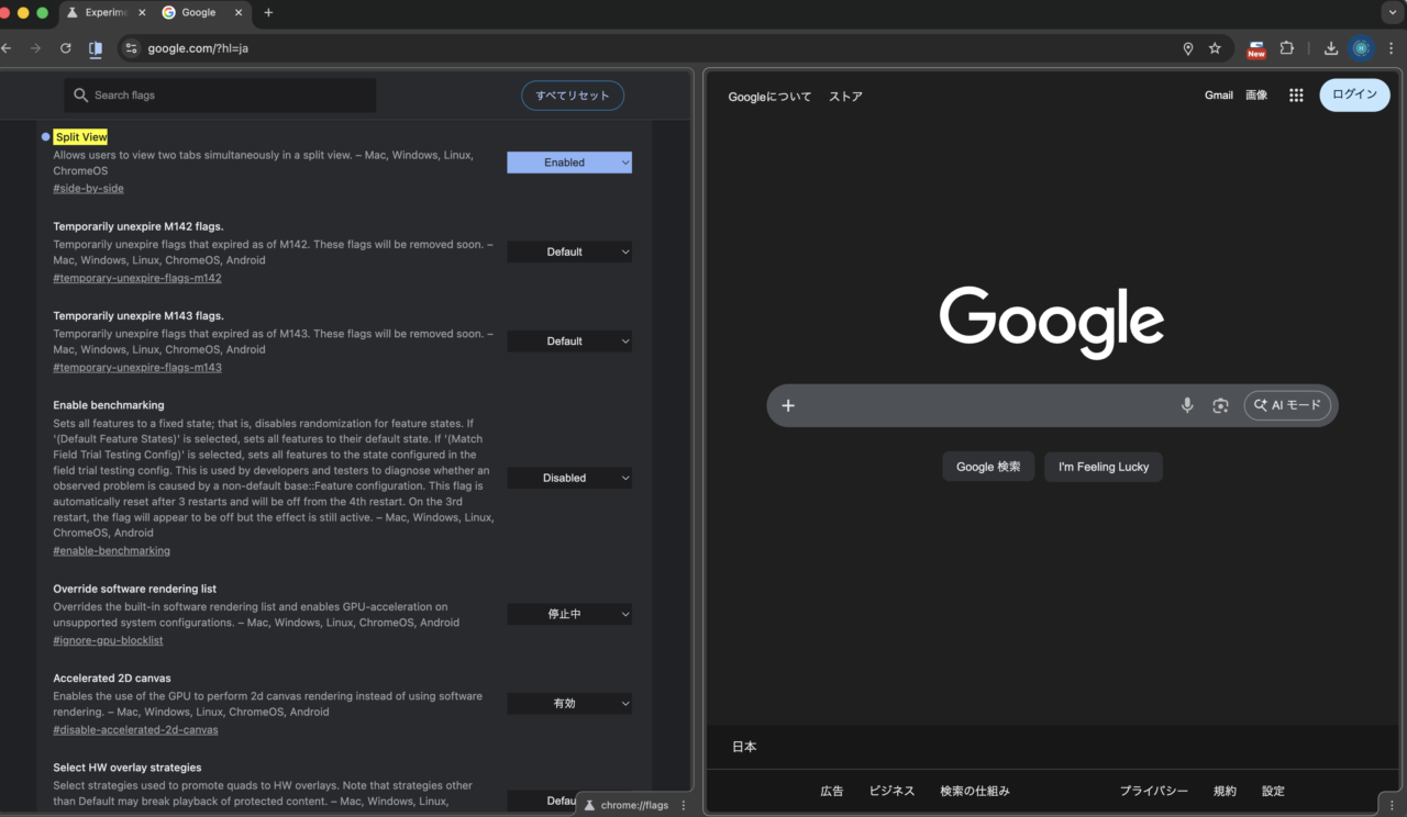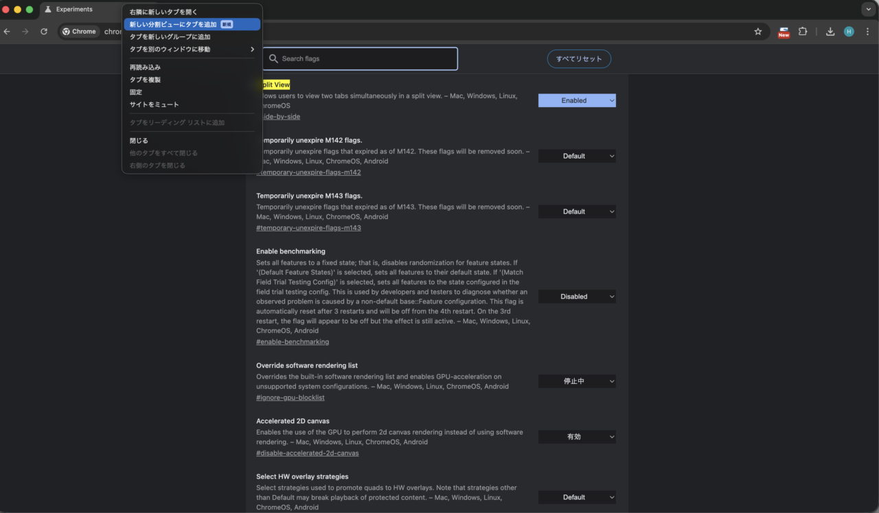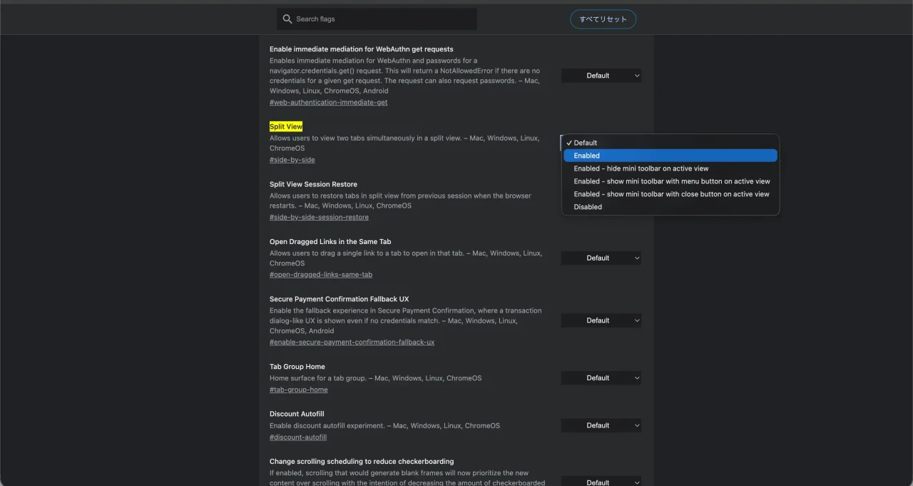 表示された画面で 「Split View」 を 「Enabled(有効)」 に設定して、Chrome を再起動するだけでOK。